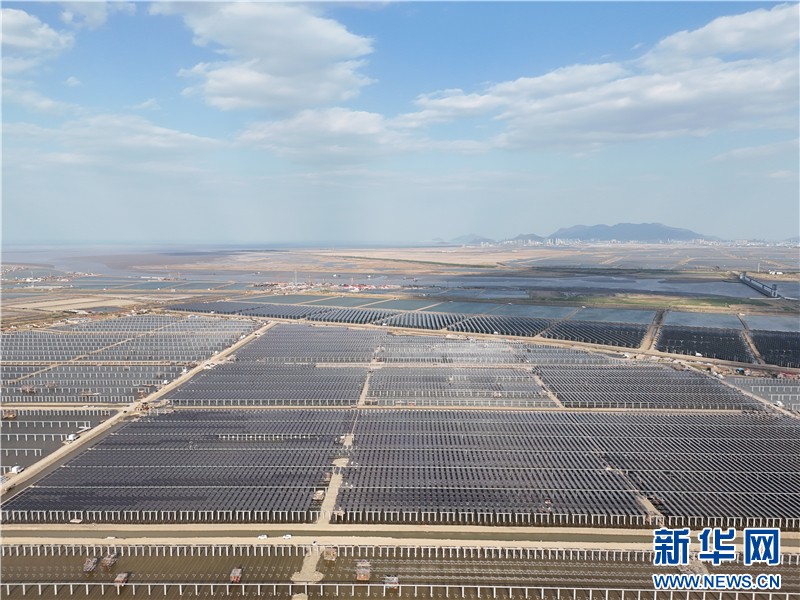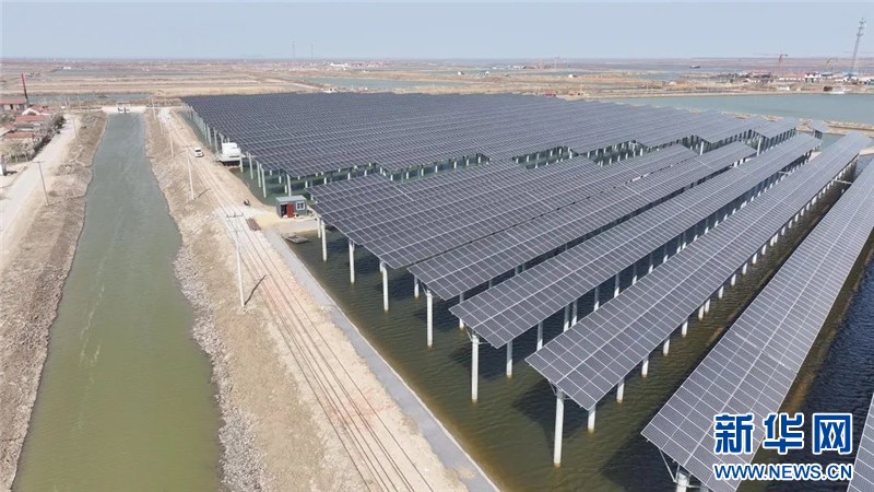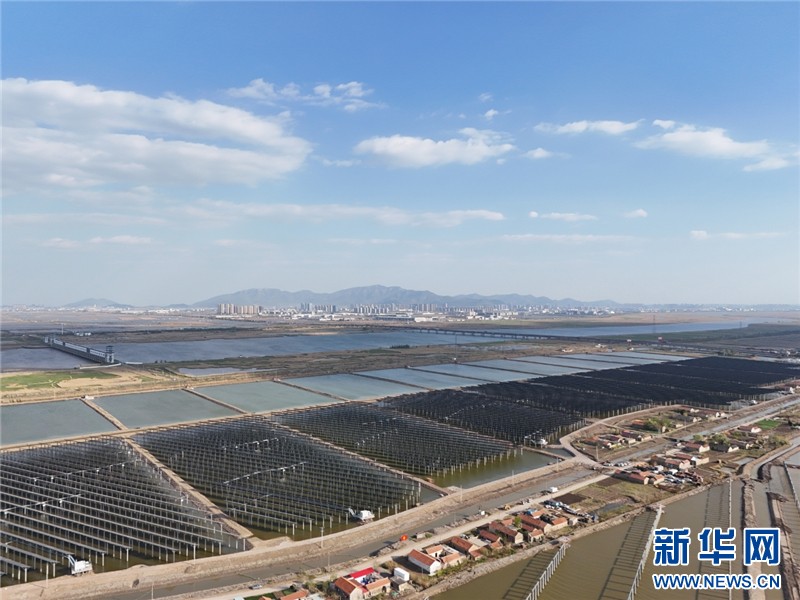 近日,在連云港經濟技術開發區猴嘴街道三峽青口鹽場,近78萬塊光伏板如波浪般起伏,深藍色板面倒映著魚塘的波光,蔚為壯觀。