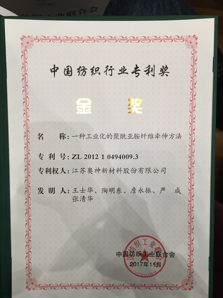 會(huì)上發(fā)布了首屆中國紡織行業(yè)專利獎(jiǎng)、全國紡織科技創(chuàng)新人才等評審結(jié)果,集團(tuán)公司副總經(jīng)理王士華獲得“全國紡織科技創(chuàng)新領(lǐng)軍人才”榮譽(yù)稱號,并作為獲獎(jiǎng)代表上臺發(fā)言。江蘇奧神新材料股份有限公司發(fā)明專利“一種工業(yè)化的聚酰亞胺纖維牽伸方法”獲得首屆中國紡織行業(yè)專利獎(jiǎng)金獎(jiǎng)。