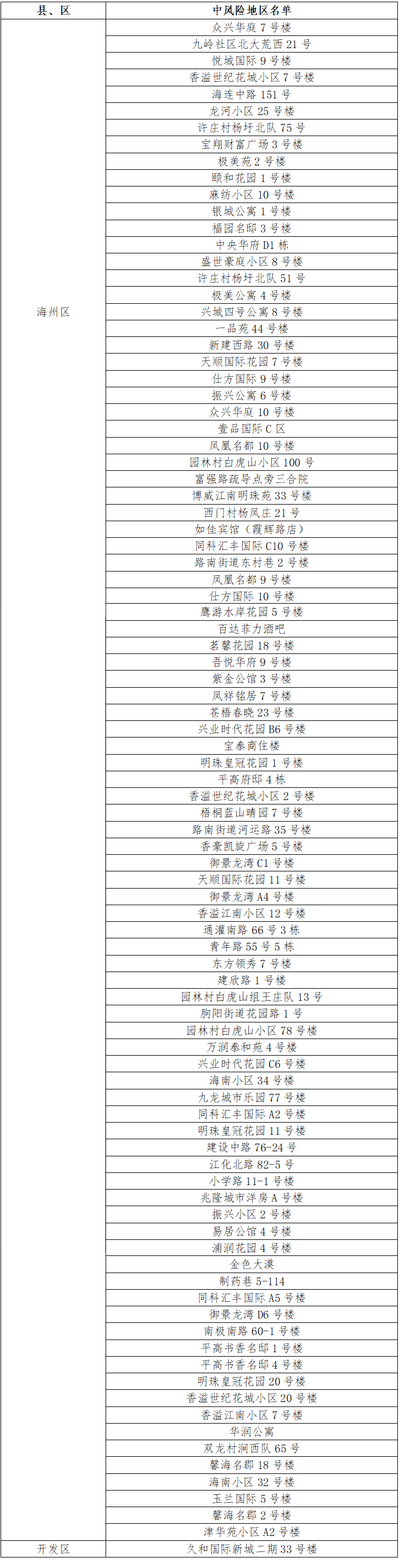 根據國務院聯防聯控機制有關規定,經市指揮部研究決定,自發布之日起,對我市部分區域疫情風險等級進行調整:海州區贛榆雞蛋菜煎餅店(洪門菜市場門口)、洪新小區90-71號,連云區萬潤華泰小區7號樓,灌云縣南崗鎮崗東村殷莊20號由中風險地區調整為低風險地區。其他地區風險等級不變。調整后全市現有92個中風險地區。 連云港市中風險地區(92個)