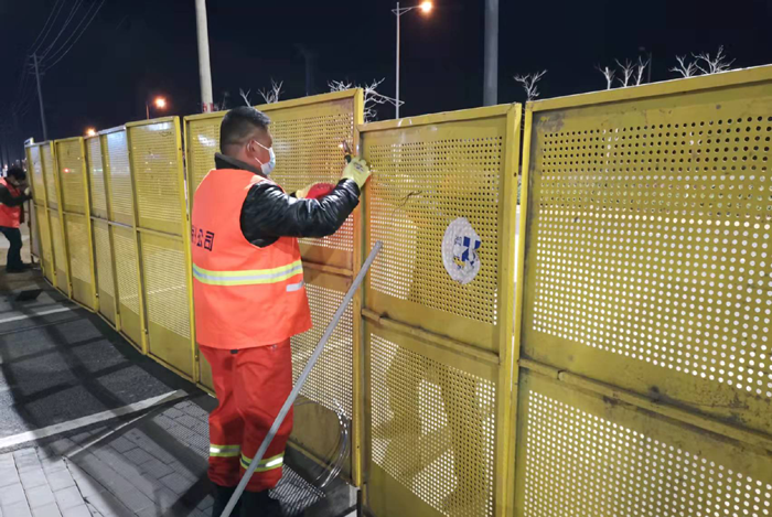疫情就是命令,防控就是責(zé)任,容不得半刻的拖沓。3月5日晚,市政分公司接到圍擋安裝工程任務(wù)后,該公司黨員骨干8名突擊隊員第一時間趕到新區(qū)方洋路、環(huán)保十路相關(guān)路口。突擊隊克服夜晚視線不好、氣溫較低等客觀困難,加班加點(diǎn)進(jìn)行圍擋安裝,歷經(jīng)大家3個多小時的突擊工作,完成安裝任務(wù)。連日來,面對肆意襲來的疫情,工作人員白天黑夜連軸轉(zhuǎn),任勞任怨,無怨無悔,放棄中午休息,路邊解決餐飲,在每一個時間節(jié)點(diǎn)按時完成各項(xiàng)安裝任務(wù),工作人員用汗水筑起“防疫鐵壁”,讓疫情“無路可逃”。