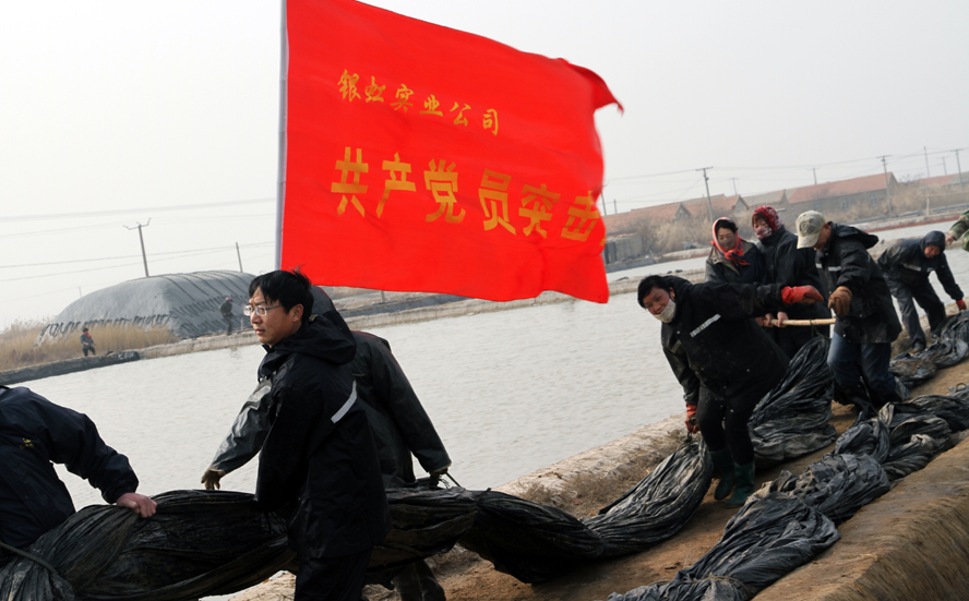 1116,一面紅色的黨員志愿者服務隊隊旗在陽光下飄展,在一片雪白結晶池埝的映襯下,顯得格外鮮艷。徐圩投資公司深港服務區12名黨員志愿者頂著寒冷的晨風,緊忙趕往新灘服務區原料鹽基地建設現場,幫助其12個單元搶裝池埝土工布,也為這個冬天添加幾許新鮮的氣息。