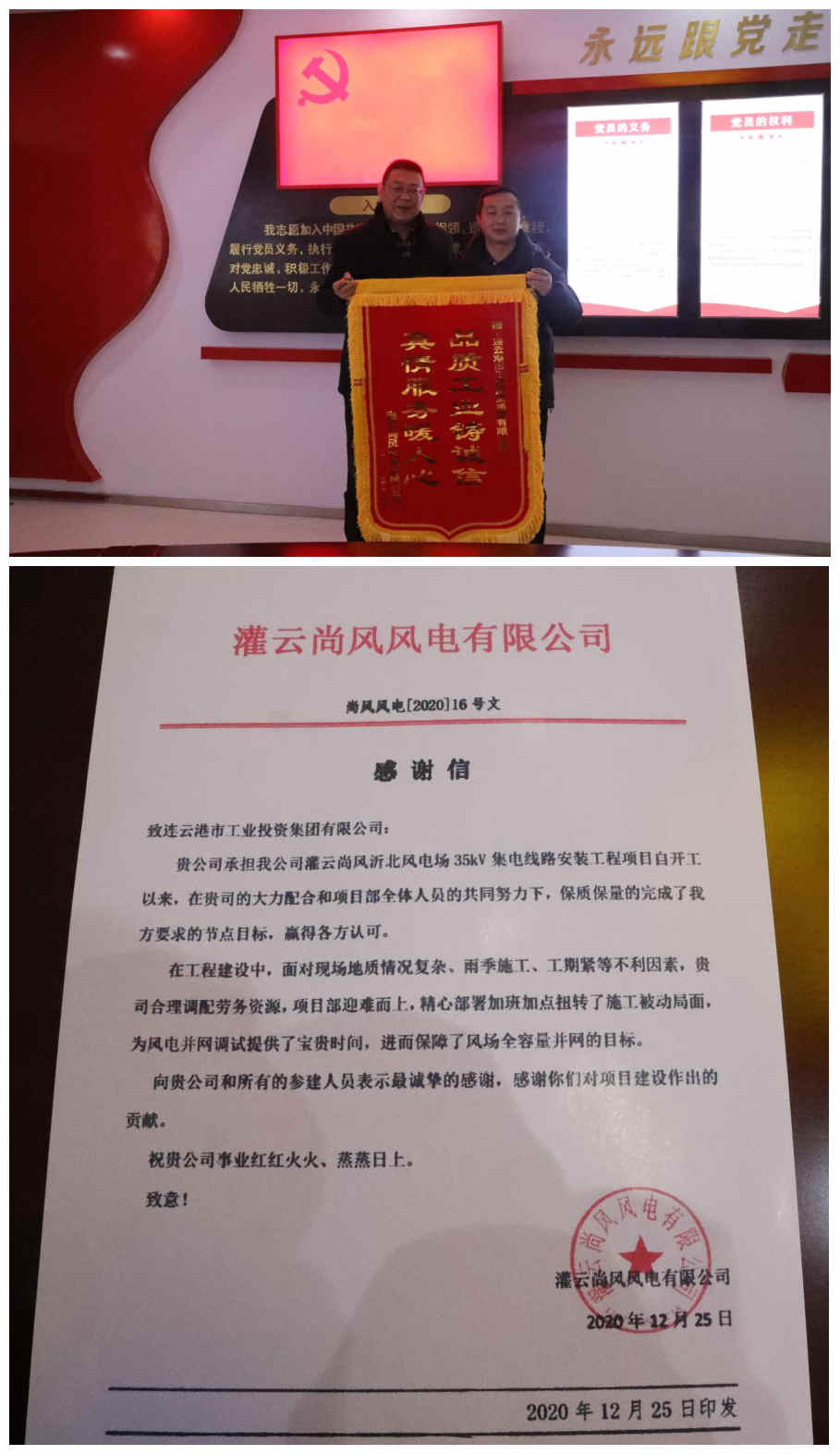 1月28日上午,灌云尚風風電有限公司副總經(jīng)理王現(xiàn)奇一行來到公司,授予我司一面錦旗和一封《感謝信》,以感謝半年來我司在灌云尚風沂北風電場35kV集電線路安裝工程項目中做出的貢獻。