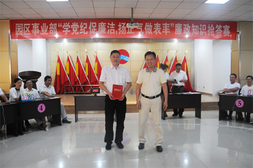 6月24日下午,由園區事業部紀委主辦的“學黨紀促廉潔,揚正氣做表率”廉政知識搶答賽在上元建材公司三樓會議室隆重舉行。公司黨總支副書記、工會主席王志軍應邀出席比賽。