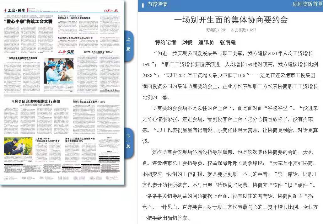 “為進(jìn)一步實(shí)現(xiàn)公司發(fā)展成果與職工共享,我方建議2021年人均工資增長15%”;“職工工資增長要循序漸進(jìn),人均增長15%相對(duì)較高,我方建議增長比例為8%”;“職工2021年工資增長最少不低于10%”……這是在連云港市工投集團(tuán)灌西投資公司的集體協(xié)商要約會(huì)上,企業(yè)方代表和職工方代表協(xié)商職工工資增長比例的一幕。