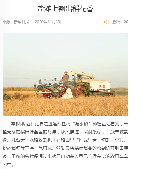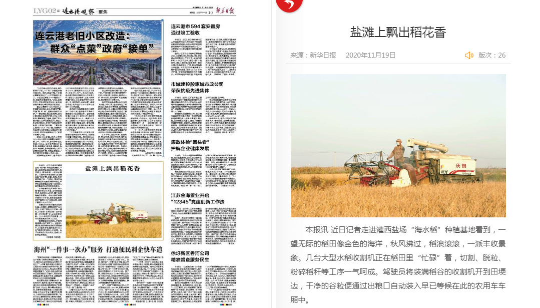 近日記者走進灌西鹽場“海水稻”種植基地看到,一望無際的稻田像金色的海洋,秋風拂過,稻浪滾滾,一派豐收景象。幾臺大型水稻收割機正在稻田里“忙碌”著,切割、脫粒、粉碎稻稈等工序一氣呵成。駕駛員將裝滿稻谷的收割機開到田埂邊,干凈的谷粒便通過出糧口自動裝入早已等候在此的農用車車廂中。