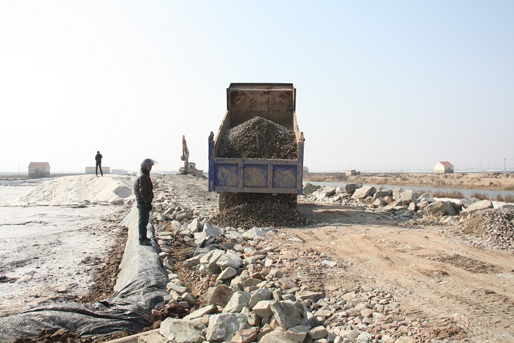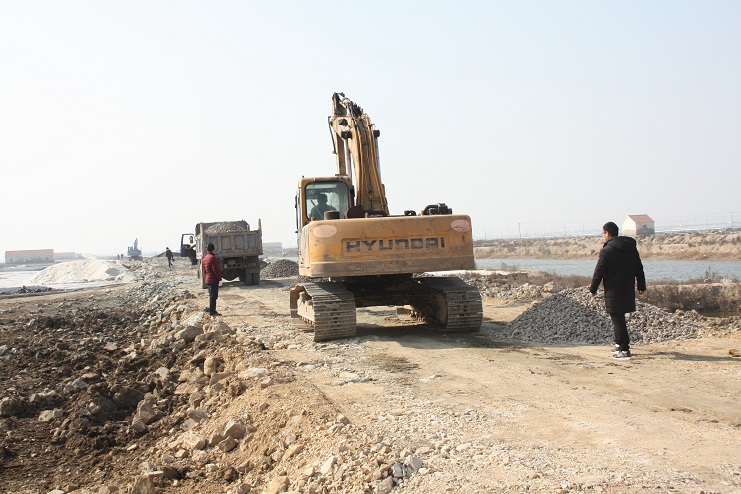 2月15日,在新河制鹽公司七至十班運(yùn)鹽路施工現(xiàn)場(chǎng),我們看到南翼公司項(xiàng)目工程分公司的員工正在指揮兩臺(tái)小型工程車將石子傾倒在路基上,兩臺(tái)挖掘機(jī)正忙于將運(yùn)送來(lái)的石子整平。運(yùn)鹽河對(duì)面,三輛滿載土夾石的大型工程車一字排開(kāi),正等待卸載。據(jù)了解,目前正在施工的是新河制鹽分公司二期運(yùn)鹽路維修改造工程,該工程改造路段全長(zhǎng)3300米,計(jì)劃總投資193萬(wàn)元,其中路基鋪設(shè)部分由日曬制鹽公司出資45萬(wàn)元,路面部分則由縣交通局承擔(dān),預(yù)計(jì)需要投入148萬(wàn)元。該工程于去年底開(kāi)始施工,預(yù)計(jì)三月中下旬全部鋪設(shè)完成。另外新河制鹽分公司一期一至十二班3300米運(yùn)鹽路改造工程計(jì)劃將于今年下半年實(shí)施。