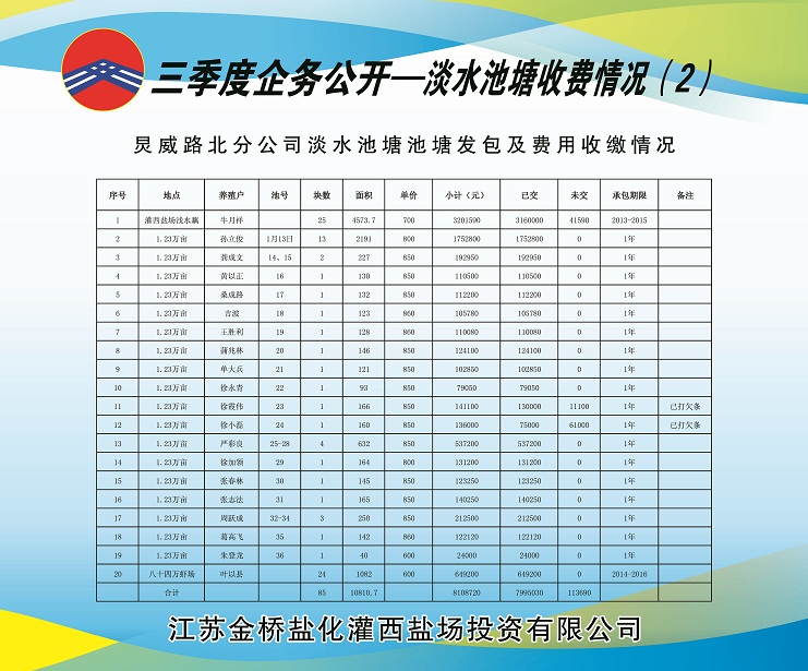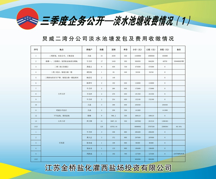 (一)海水養(yǎng)殖池塘發(fā)包及費用收繳情況:共發(fā)包海水養(yǎng)殖池塘面積11927畝,應(yīng)收租賃費382.7350萬元,已收租賃費382.2690萬元,欠收租賃費65.8970萬元,收繳率為84.33%。