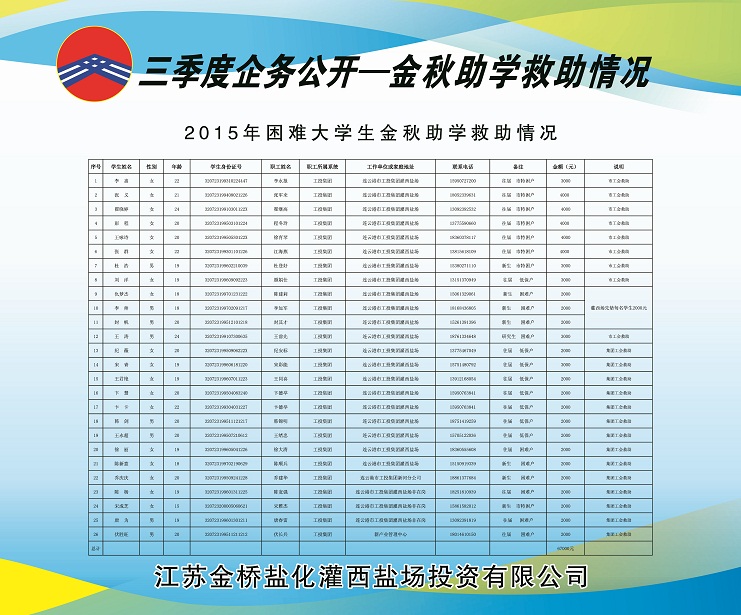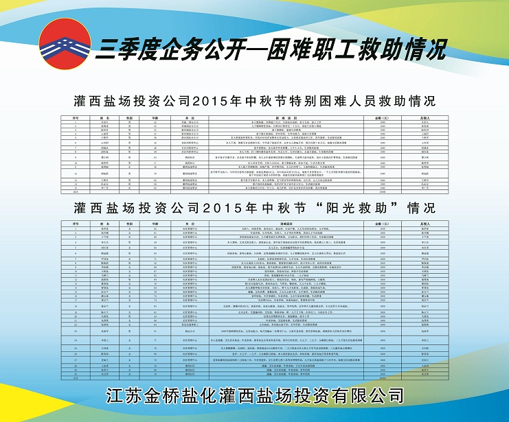 三季度,公司黨委積極做好走訪慰問、送溫曖工作,灌西鹽場投資公司、日曬制鹽公司對30名困職工發(fā)放陽光救助金30000元;對15名患重大疾病困職工及直系親屬發(fā)放救助金15000元;對26名困難大學生實行金秋助學金67000元。具體情況請查看公示展板。