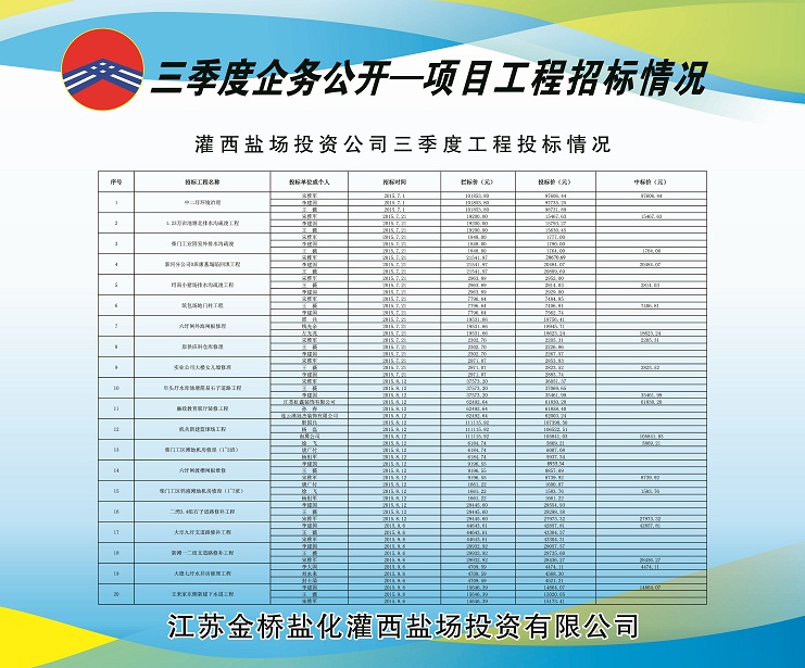 三季度灌西共開工建設(shè)20個工程項目,分4次由投資公司招標領(lǐng)導小組采用公開邀標形式進行了招標。