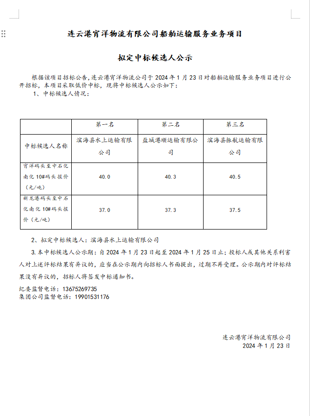 連云港宵洋物流有限公司船舶運輸服務(wù)業(yè)務(wù)項目擬定中標候選人公示