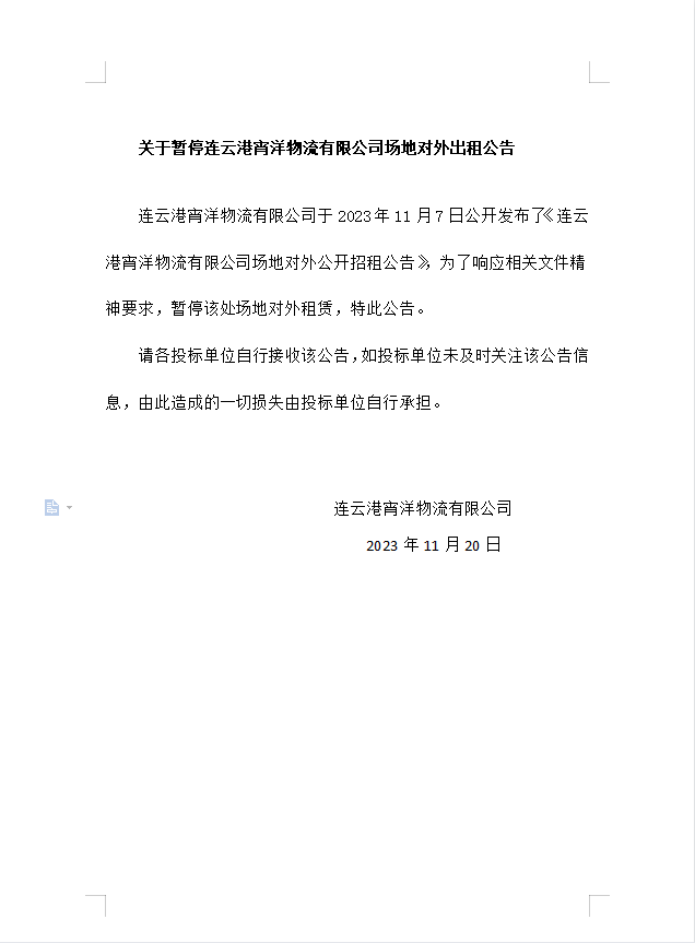 關(guān)于暫停連云港宵洋物流有限公司場地對(duì)外出租公告