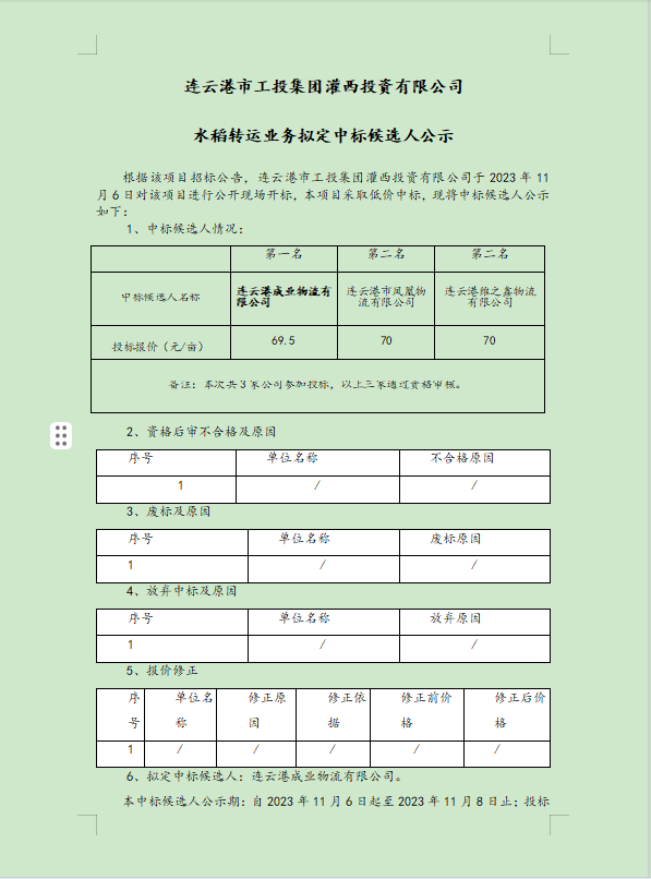 連云港市工投集團灌西投資有限公司水稻轉運業務擬定中標候選人公示