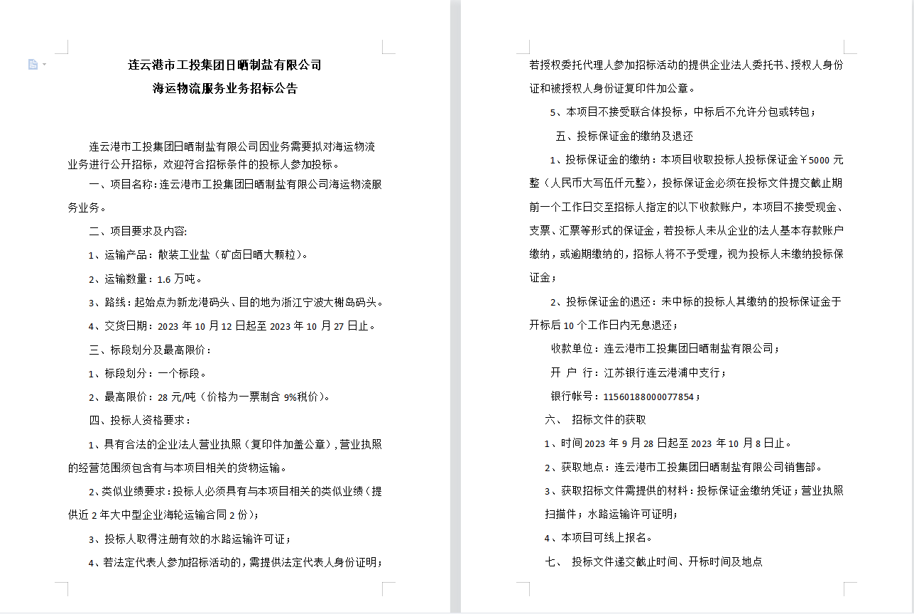 連云港市工投集團日曬制鹽有限公司海運物流服務業務招標公告