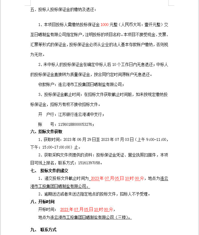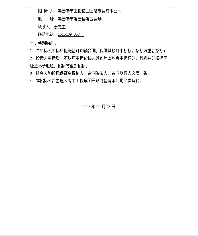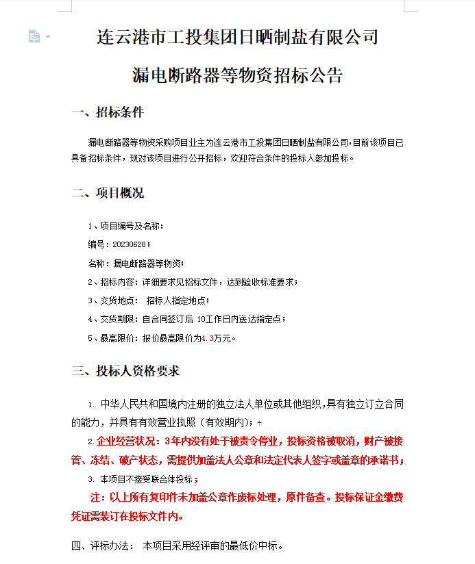 連云港市工投集團(tuán)日曬制鹽有限公司漏電斷路器等物資招標(biāo)公告