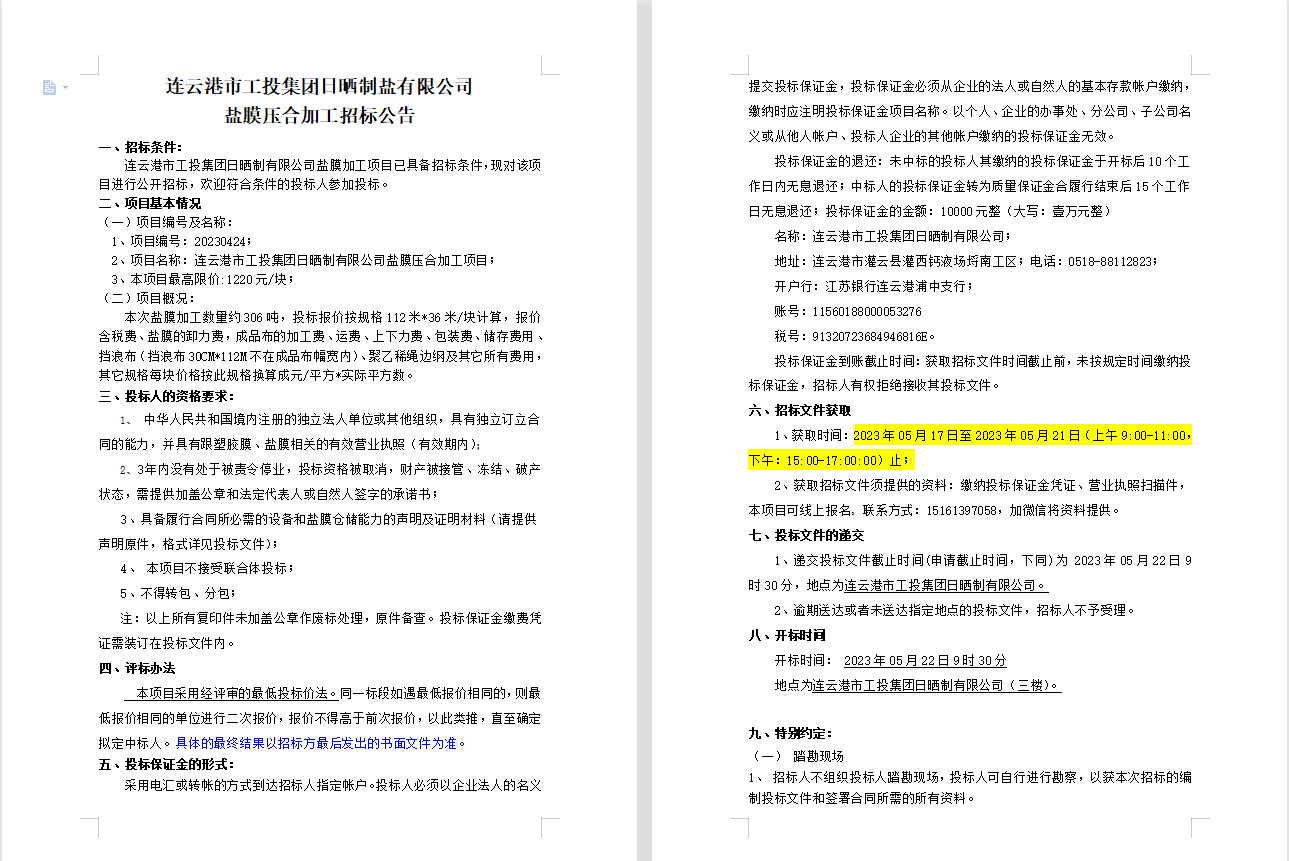 連云港市工投集團日曬制鹽有限公司鹽膜壓合加工招標公告