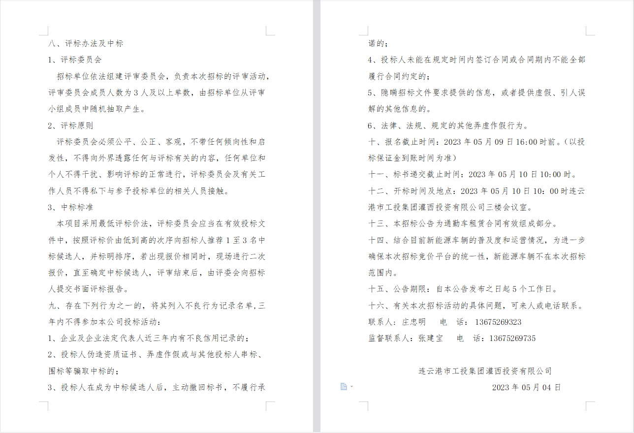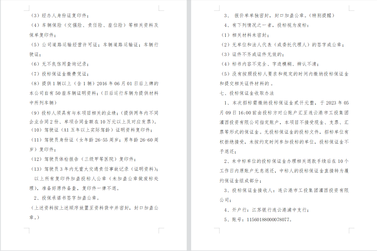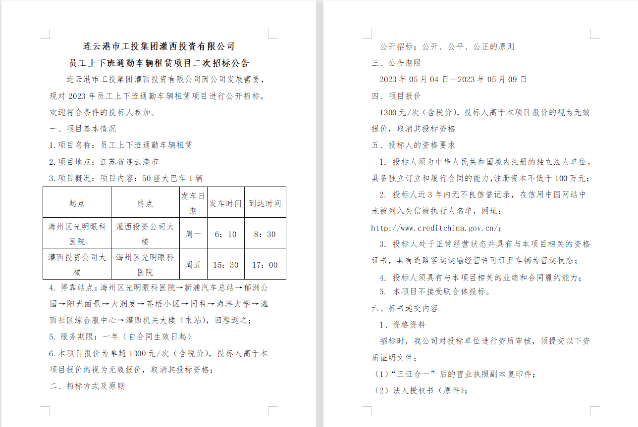 連云港市工投集團灌西投資有限公司 員工上下班通勤車輛租賃項目二次招標公告