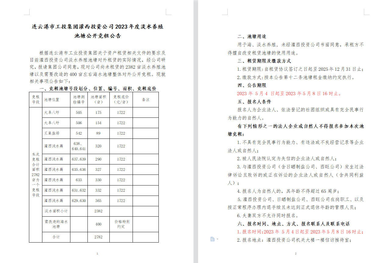 連云港市工投集團(tuán)灌西投資公司2023年度淡水養(yǎng)殖池塘公開競(jìng)租公告