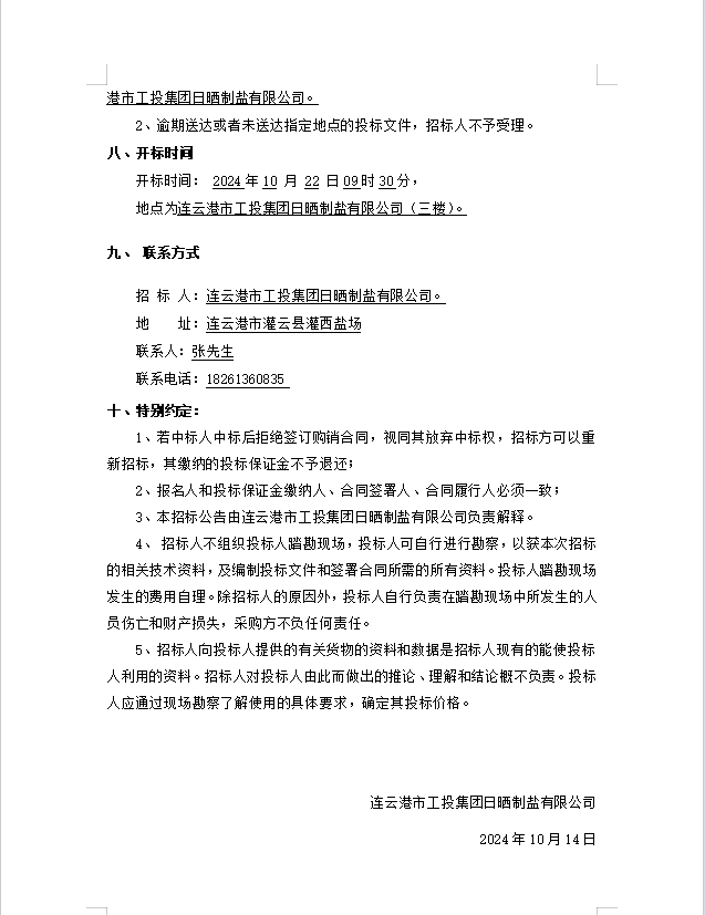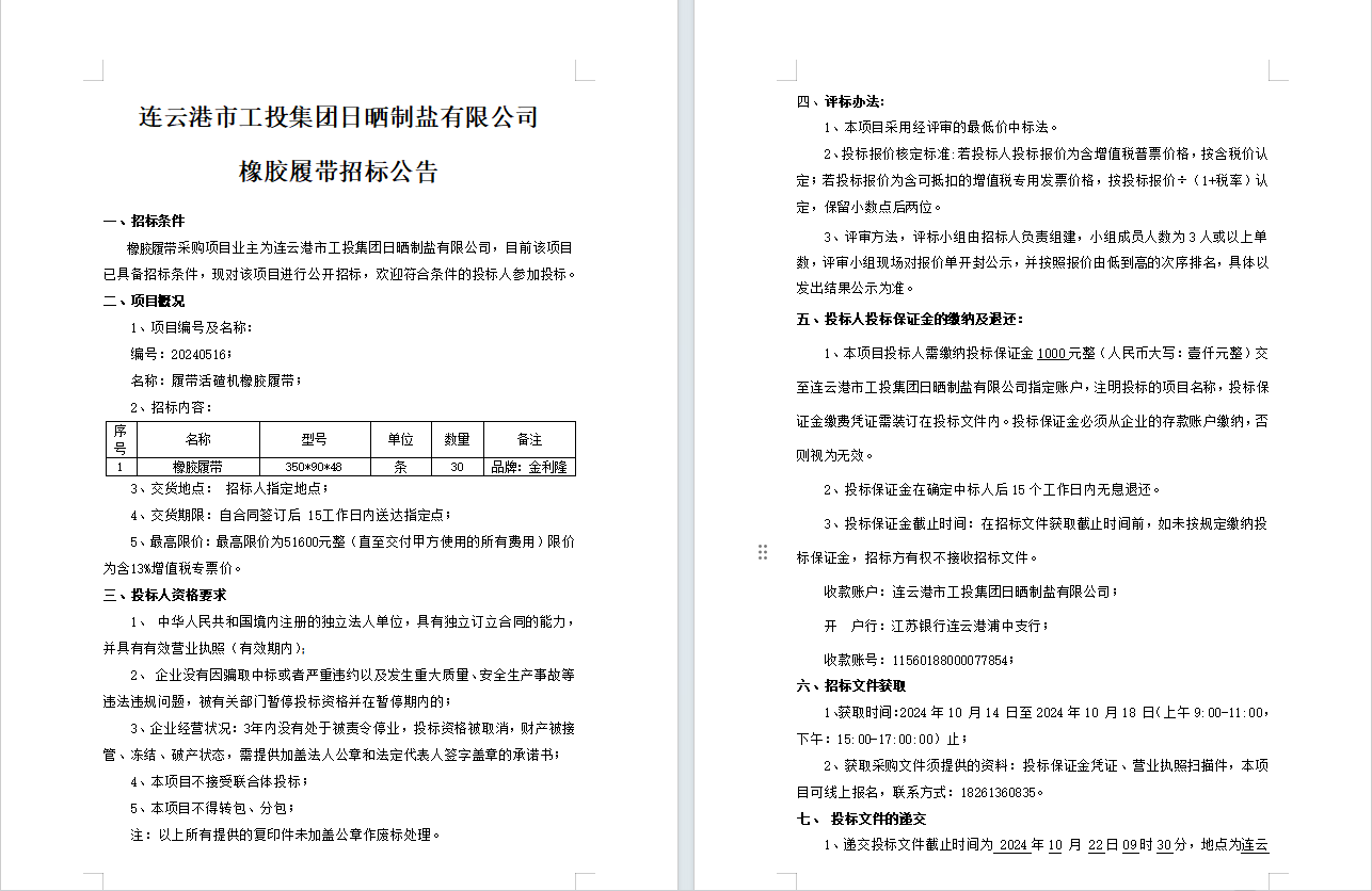 連云港市工投集團日曬制鹽有限公司橡膠履帶招標公告
