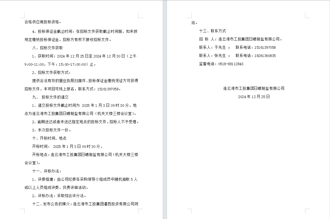 連云港市工投集團日曬制鹽有限公司五金產品合格供應商招標公告