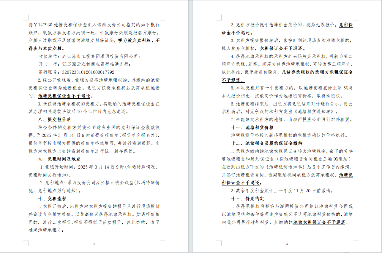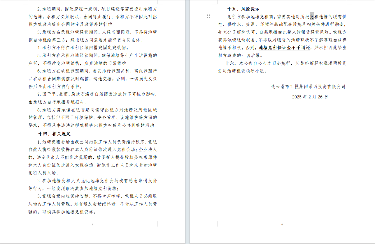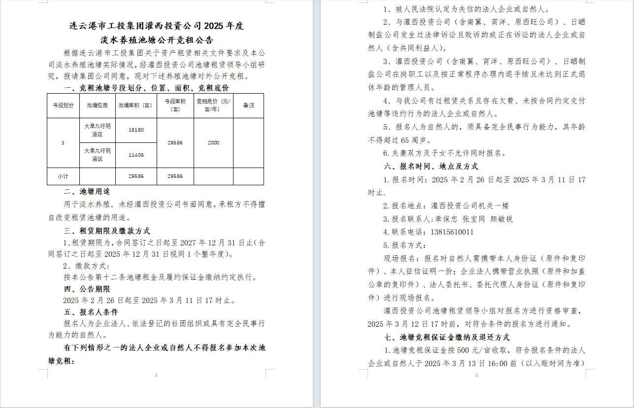 連云港市工投集團灌西投資公司2025年度淡水養殖池塘公開競租公告
