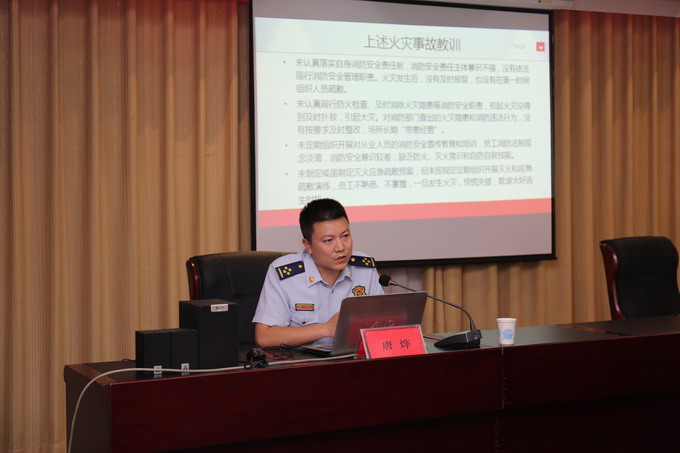 為規(guī)范消防安全管理,提高公司干部職工消防安全意識和火災應急處置能力,7月7日,我公司邀請連云區(qū)消防隊副隊長唐燁,在三樓會議室開展消防安全知識培訓。公司董事長、黨委書記、總經(jīng)理朱桂玉,黨委副書記、工會主席曹開明,副總經(jīng)理何啟明,總經(jīng)理助理李忠祥,各單位、車間、部室人員參加了培訓。