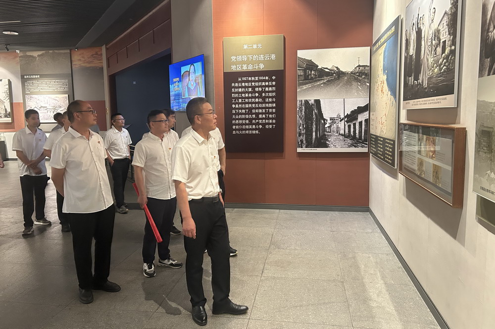 在連云港市革命博物館莊嚴肅穆的展廳內,大家認真聆聽講解員講述連云港地區的革命斗爭史。一件件珍貴的歷史文物、一幅幅生動的歷史照片,再現了革命先烈們為民族解放事業英勇奮斗的光輝歷程。在革命烈士浮雕前,全體黨員整齊列隊,重溫入黨誓詞,強化政治信仰,增強責任擔當。