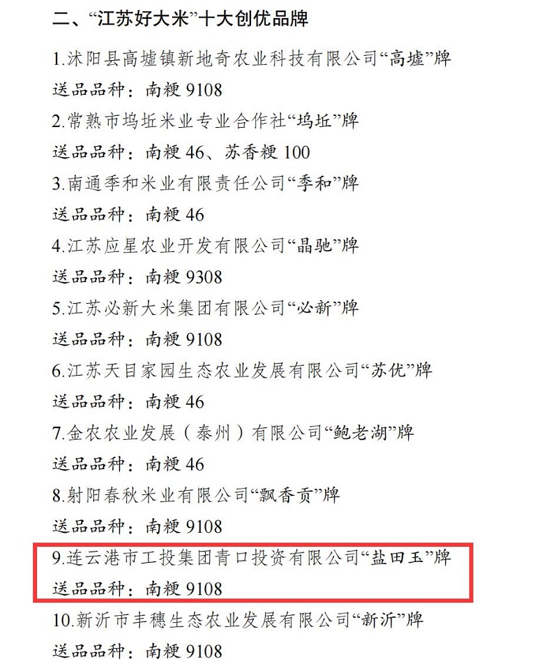 近日,第八屆江蘇好大米評鑒推介結果公布,“鹽田玉”品牌再創(chuàng)佳績,榮獲“江蘇好大米”十大創(chuàng)優(yōu)品牌。