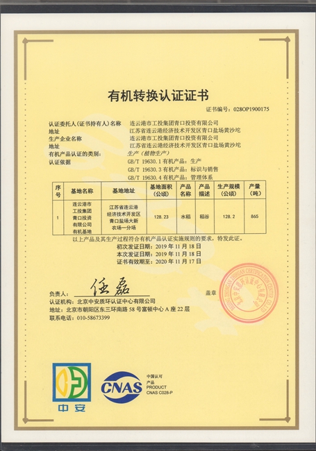 11月25日上午,我公司種植的“南粳9108”有機大米經過嚴格認真的檢測和審核,獲得北京中安質環認證中心頒發的有機轉換認證證書。
