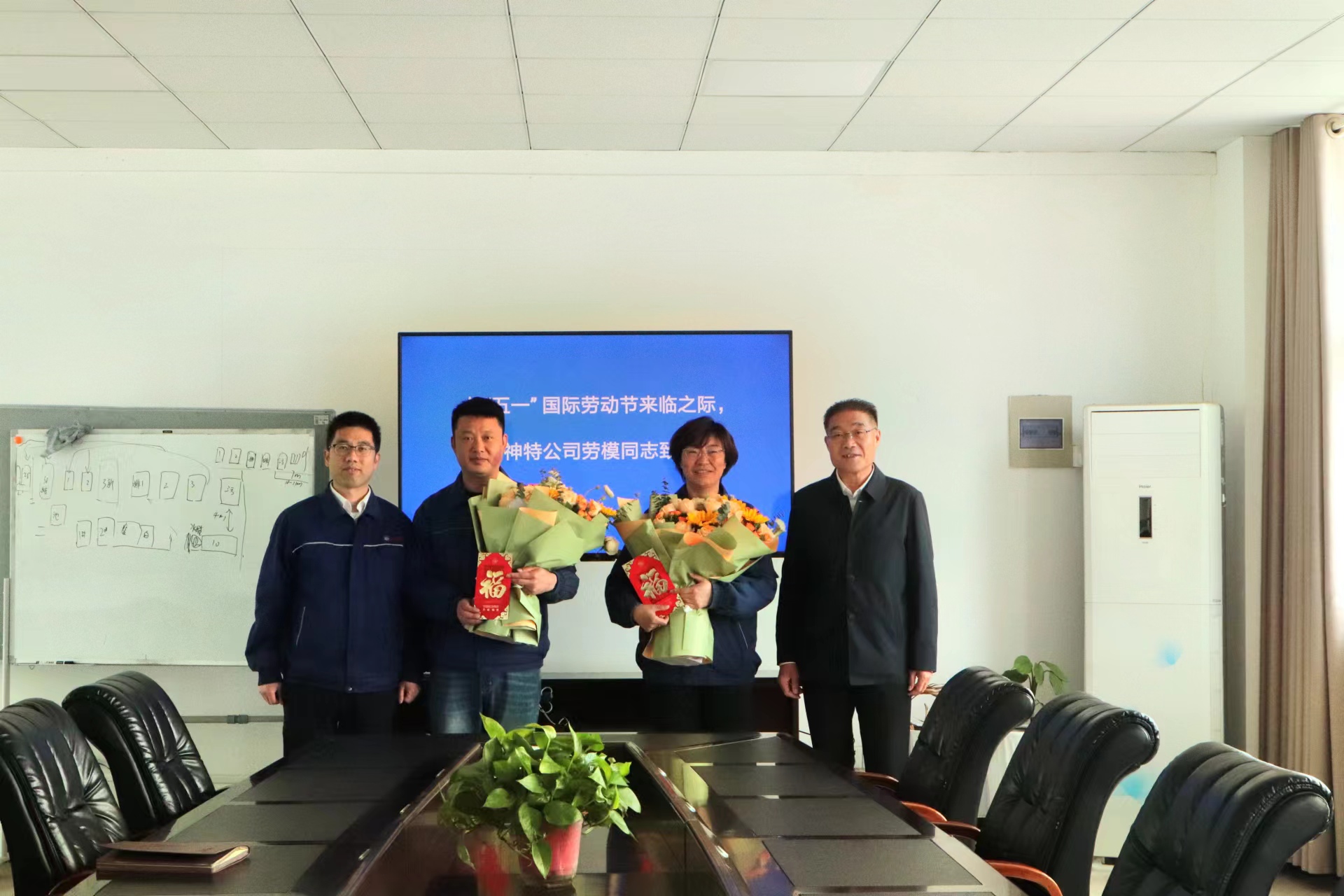 劉總與兩名市勞模面對面交流,傾聽他們的心聲和意見,感謝他們長期以來為企業發展作出的貢獻,并獻上一束鮮花、送上一份慰問、表達一段祝福。