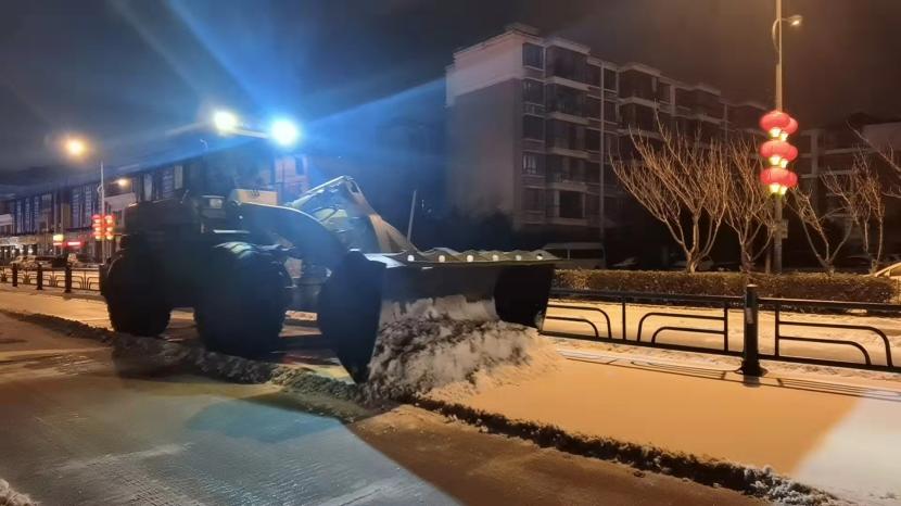 當晚,按照“即下即清、先通后凈、保障通行”的清雪除冰原則,在統(tǒng)一調度下,一臺臺清雪設備有序穿行于道路上,撒布機打頭陣,推雪板車緊隨其后,將路面積雪進行打通,地上的雪從前向后逐次被清雪車輛推向道路邊緣。隨后,由人工加以配合,在人機結合方式下,冰雪被裝到車上清運走。