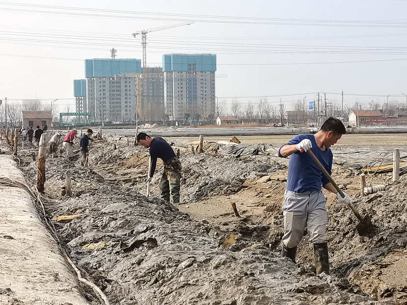 礦鹽復產(chǎn)項目部,聘請日曬制鹽專家王緒前進行工藝指導,聘請勞模朱春年帶領團隊攻堅。復產(chǎn)戰(zhàn)役從2021年12月就打響了,春節(jié)的時候,他們僅休了三天假,大年初三全部到崗,一鍬一鍬挖泥通溝,一條一條池堰加高整平,一塊一塊鹽田清理壓實......到2月,他們硬是把征地后廢棄許久的鹽田和邊角地整理成礦鹽基地,結晶池面積達1950公畝,達產(chǎn)可產(chǎn)原鹽20000噸。