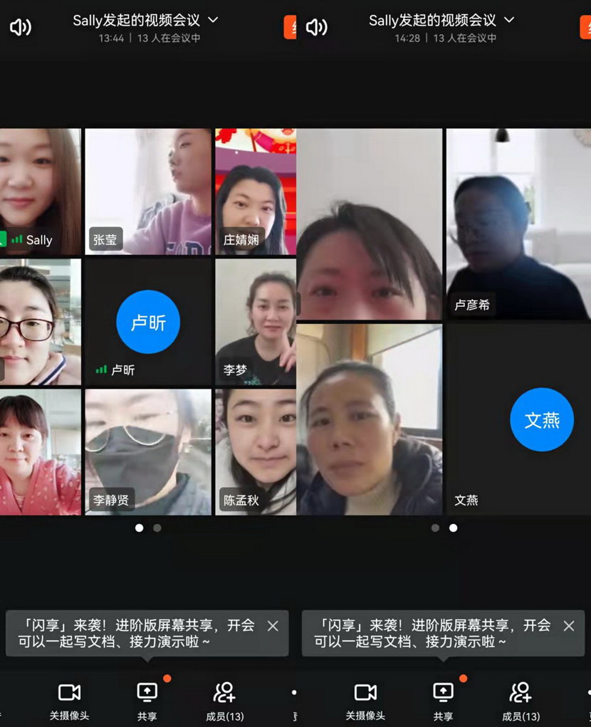 線上貢獻篇。“縱然居家隔離,一樣不防礙我們做貢獻,我們線上服務已經開啟”三八節這一天,在社區忙碌一天的公司女工委副主任宋文靜又特意安排了“三八”節線上活動。這一天活動精彩紛呈:首先是視頻連線,通過廣大女工并向她們家人傳達市委市政府以及集團黨委、投資公司黨委關于疫情防控文件精神。其次共同學習全國“兩會”會議精神。第三,開展公司“三新”解放思想大討論線上論壇,圍繞疫情防控、生產經營,尤其是企業轉型發展出謀劃策。最后還來了點小游戲-成語“飛花令”,給嚴肅的疫情防控增添了一息歡樂的氛圍。