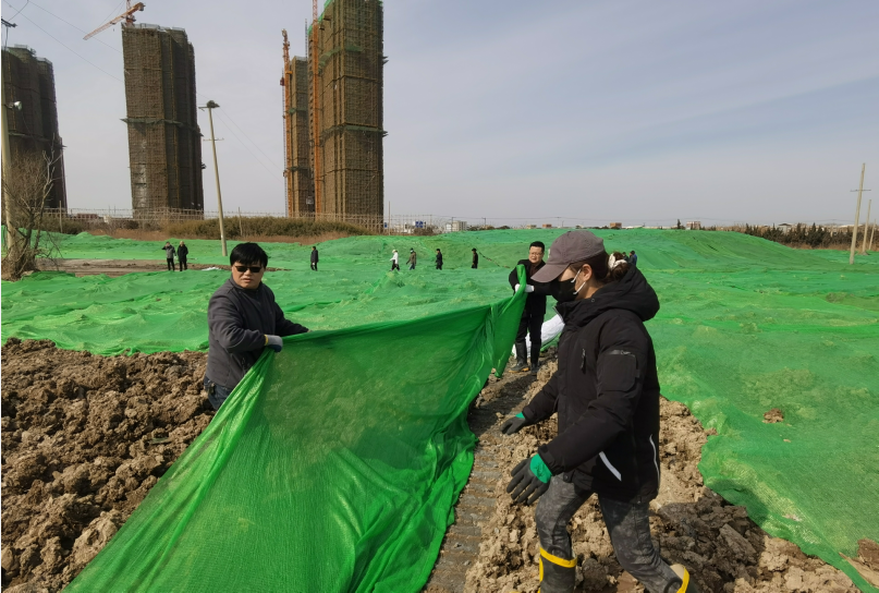 寒冷絲毫沒有降低大家的熱情,路面因為每天噴灑防塵導致潮濕泥濘,大家穿上雨靴,爬上爬下,一鼓作氣,經過兩天齊心協力的辛勤勞作,防塵網終于覆蓋完畢。遠遠望去,覆蓋綠網后的區域如同覆蓋了一片綠色植被。此次綠網覆蓋行動,不僅抑制了二次揚塵污染環境,保護了生態環境,同時達到了環境美化的效果。