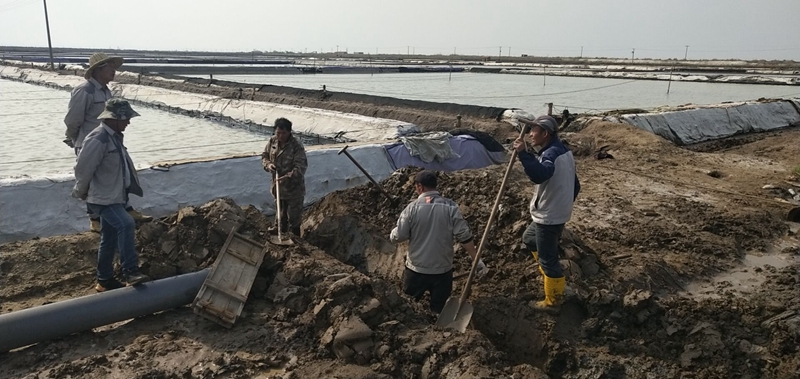 “一二三、起,注意塑布壞的地方要抓緊了”,在西灘組長沈秀成的帶領下,大家正在清理塑布積水,一場暴風雨過后,灘面積聚了大量雨水,擋浪布也損壞較多,為了不影響下一步的人工扒鹽,大伙迅速做好災后修復工作,保住生產成果,確保顆粒歸倉。
