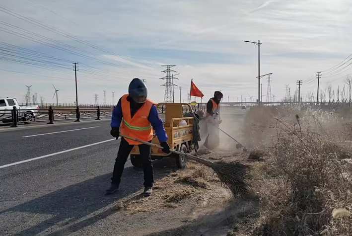 該分公司注重細節,不斷強化突擊治理成效,第一時間策劃保潔方案。園區兩個班組35名保潔員工在公司統一指揮下,步調一致,無懼三九嚴寒低溫天氣,兩人一對,三人一組,舞動掃把,清掃輔道泥土雜草;勞動現場,黨員先鋒無處不在,石峰、朱海勇、楊靜等同志,身背幾十斤重打草機械,盡管汗水浸濕橙色衣衫,累得腰酸背痛,無所怨言,仍然擺動雙臂,經過近三天的努力奮戰,收割石化三道、十道、復堆河路牙,輔道雜草3000多米長,清理管廊、取水點隱藏各類白色垃圾400多包,轉運20余車,人工清掃路面2000多米長。